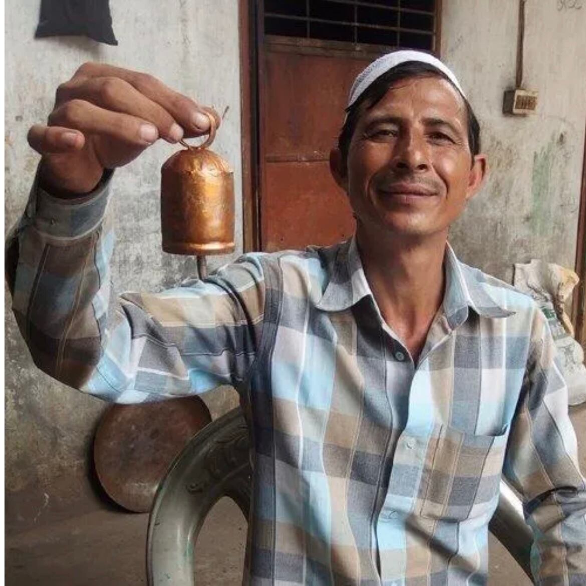 まずは、リサイクル鉄の板をカットし、たたいてベルの形に。