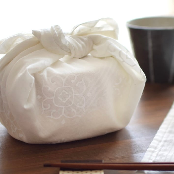 インドの伝統的なブロックプリントのハンカチです。白地に白いペイントが爽やかで清潔感のある雰囲気。大判タイプなのでお弁当の包みとしてもおすすめです。
